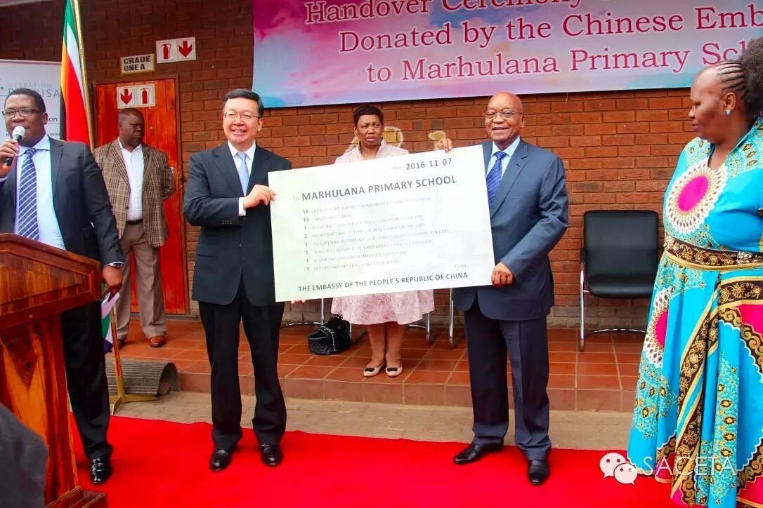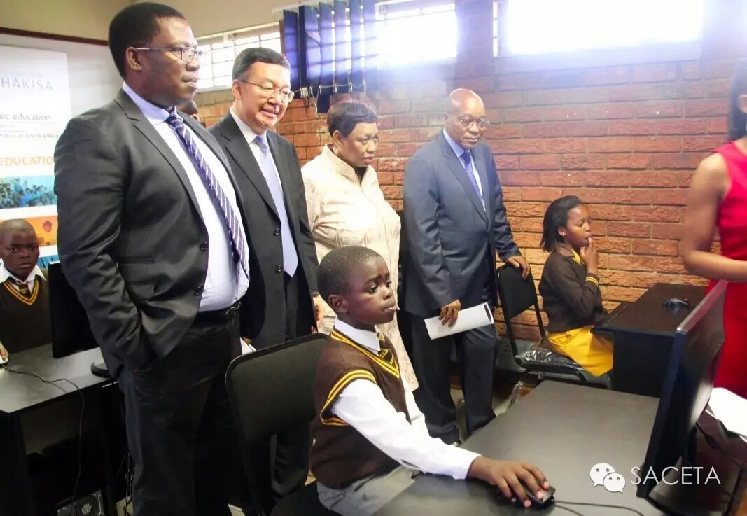 11月7日,南非總統(tǒng)雅各布祖馬,基礎教育部長莫采卡,豪登省主管教育的副省長勒蘇斐,中國駐南非大使館田學軍協(xié)同及該校師生100多人一起參加為南非當?shù)貙W校捐贈電腦和體育器材活動。